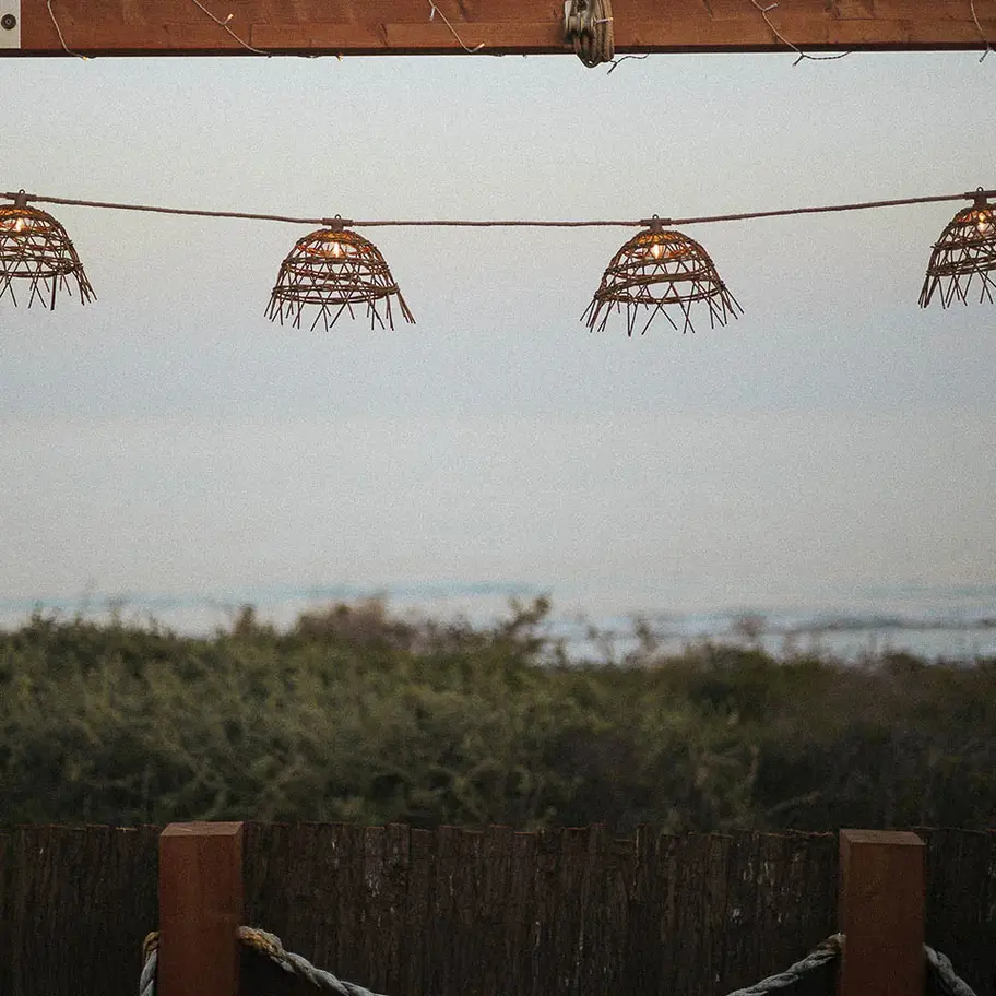 De ALMA lichtslinger is dé sfeermaker voor bruiloften, diners, evenementen en horecaterrassen. Dankzij de natuurlijke jute afwerking, handgemaakte kapjes van vezels en warme vintage verlichting voegt deze lichtslinger direct sfeer en karakter toe aan elke ruimte.